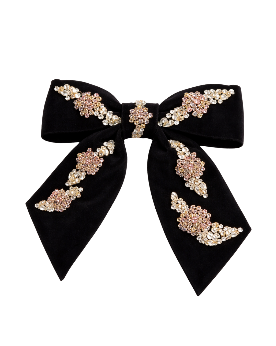 A black bow hair clip, delicately hand-embellished with champagne and crystal accents for a timeless, luminous finish.