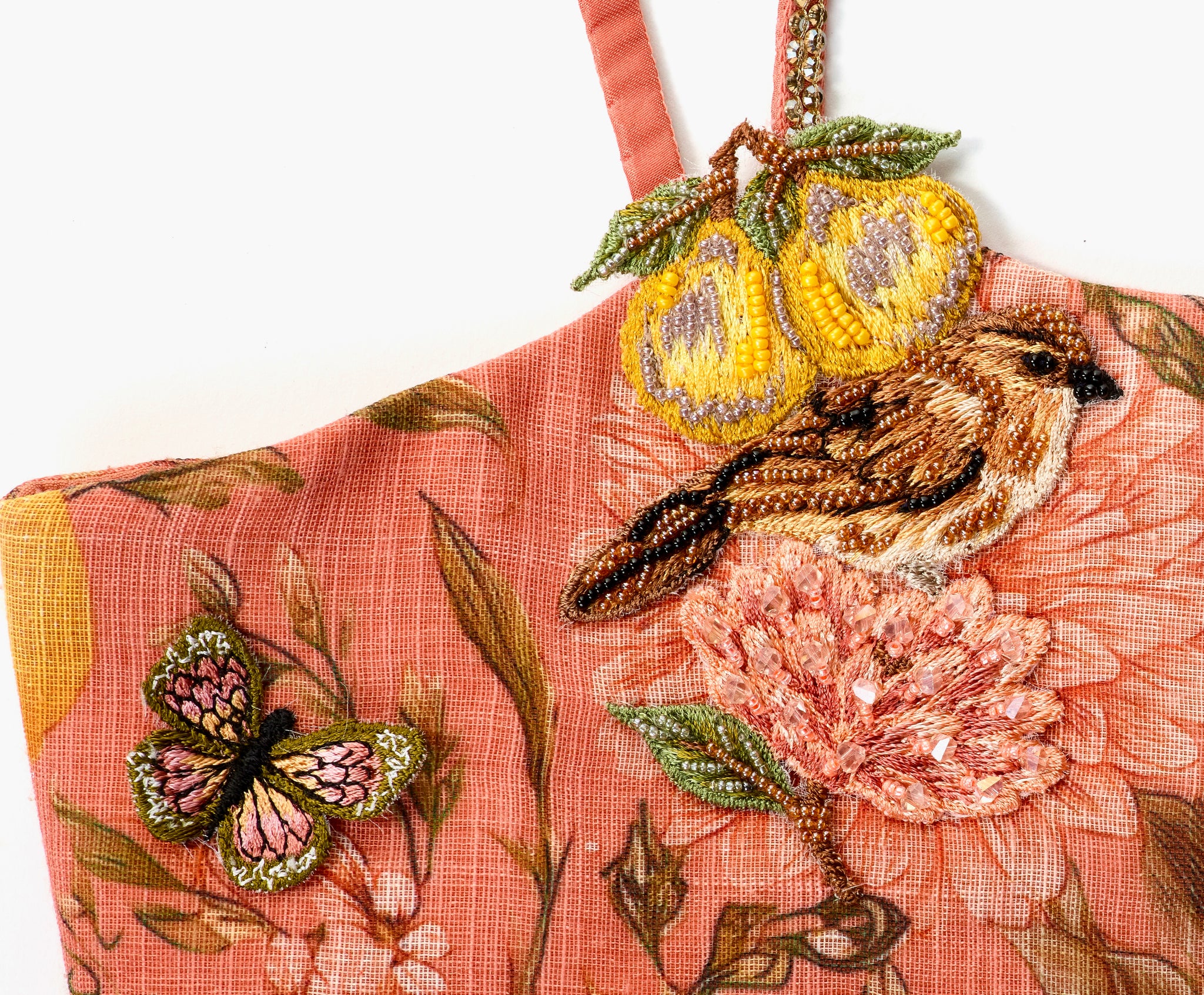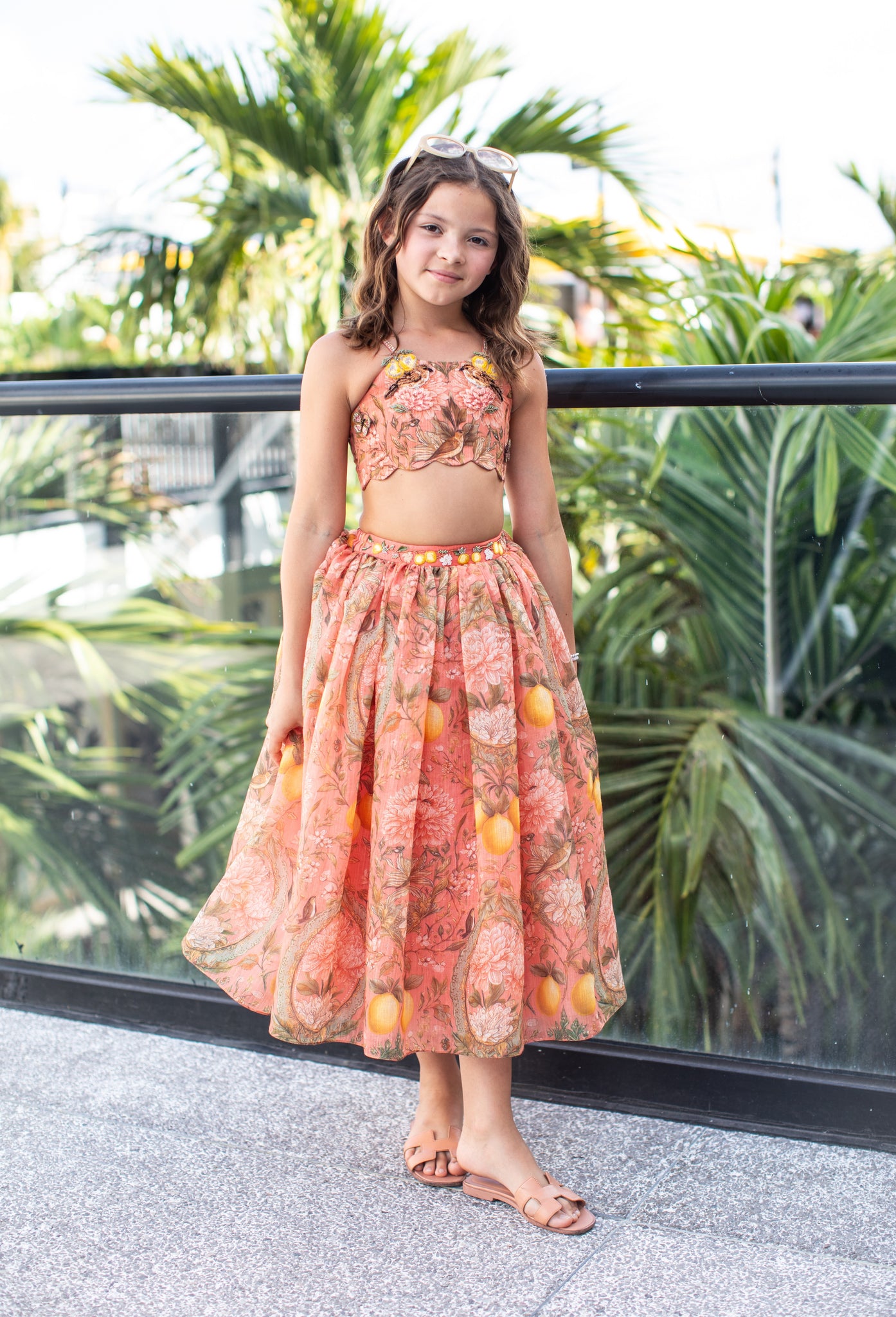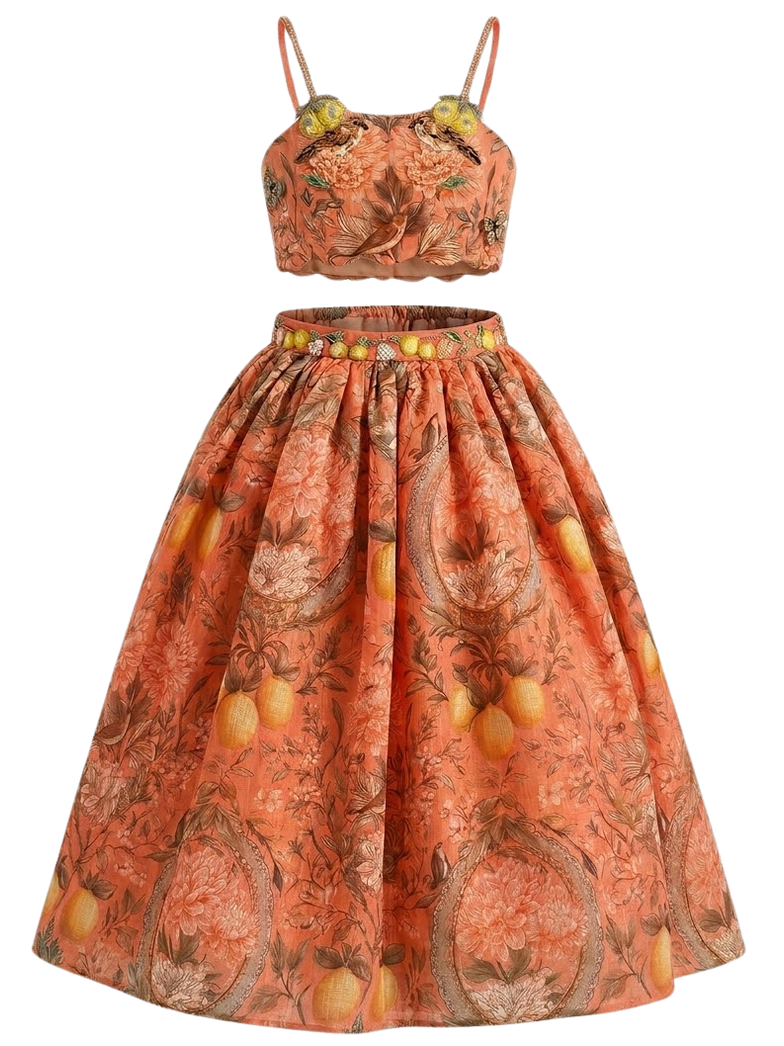 A two-piece set crafted from custom printed silk organza featuring intricate florals, birds, and lemon motifs inspired by summer orchards. The delicate crop top pairs with a voluminous gathered skirt finished with embroidered lemon details along the waistband, creating an expressive silhouette for special occasions.