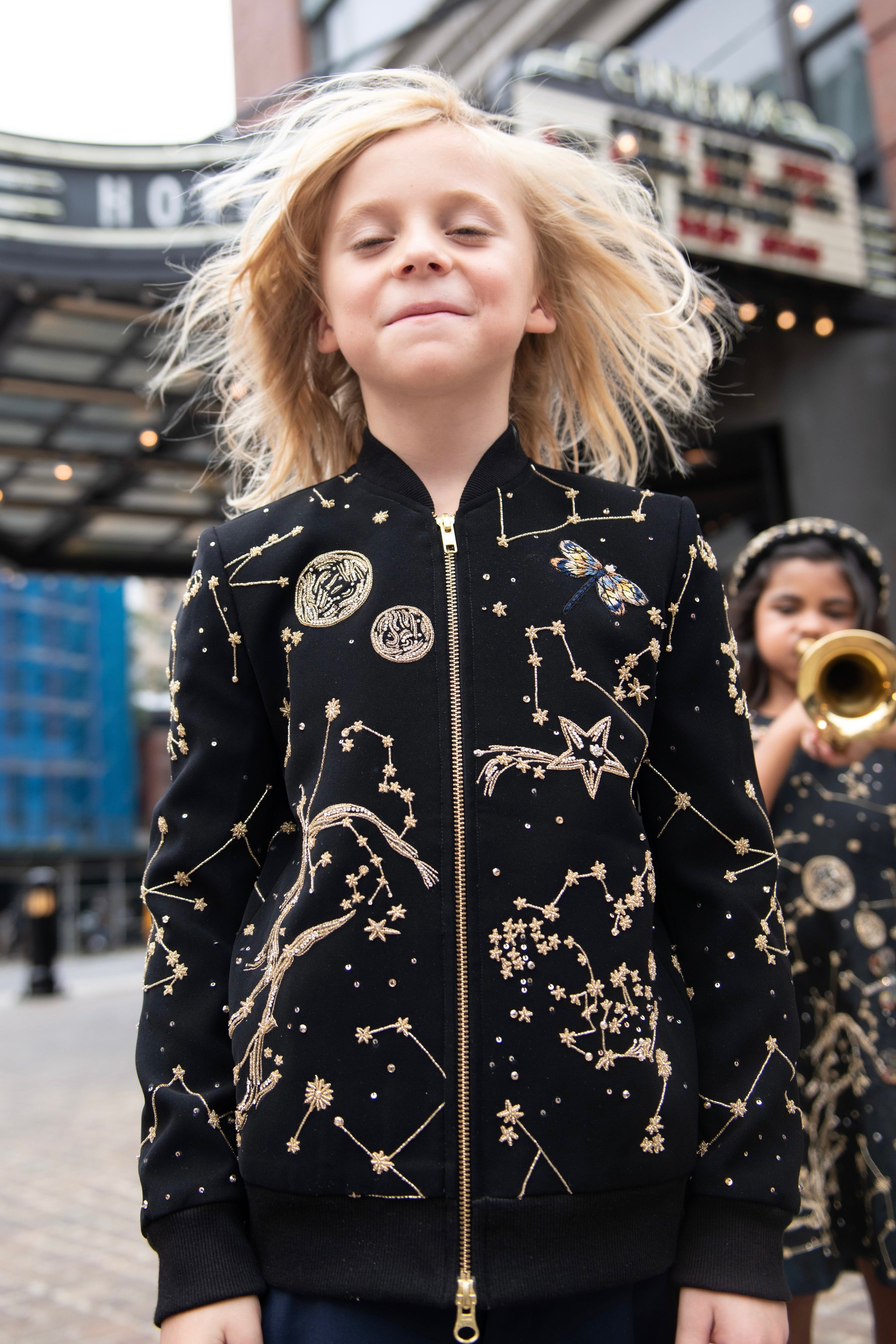 This velvet bomber jacket features hand-embroidered stars and planets for a cosmic look. The soft velvet feels rich, while a bright blue dragonfly adds a pop of color. It combines elegant style with a playful touch.