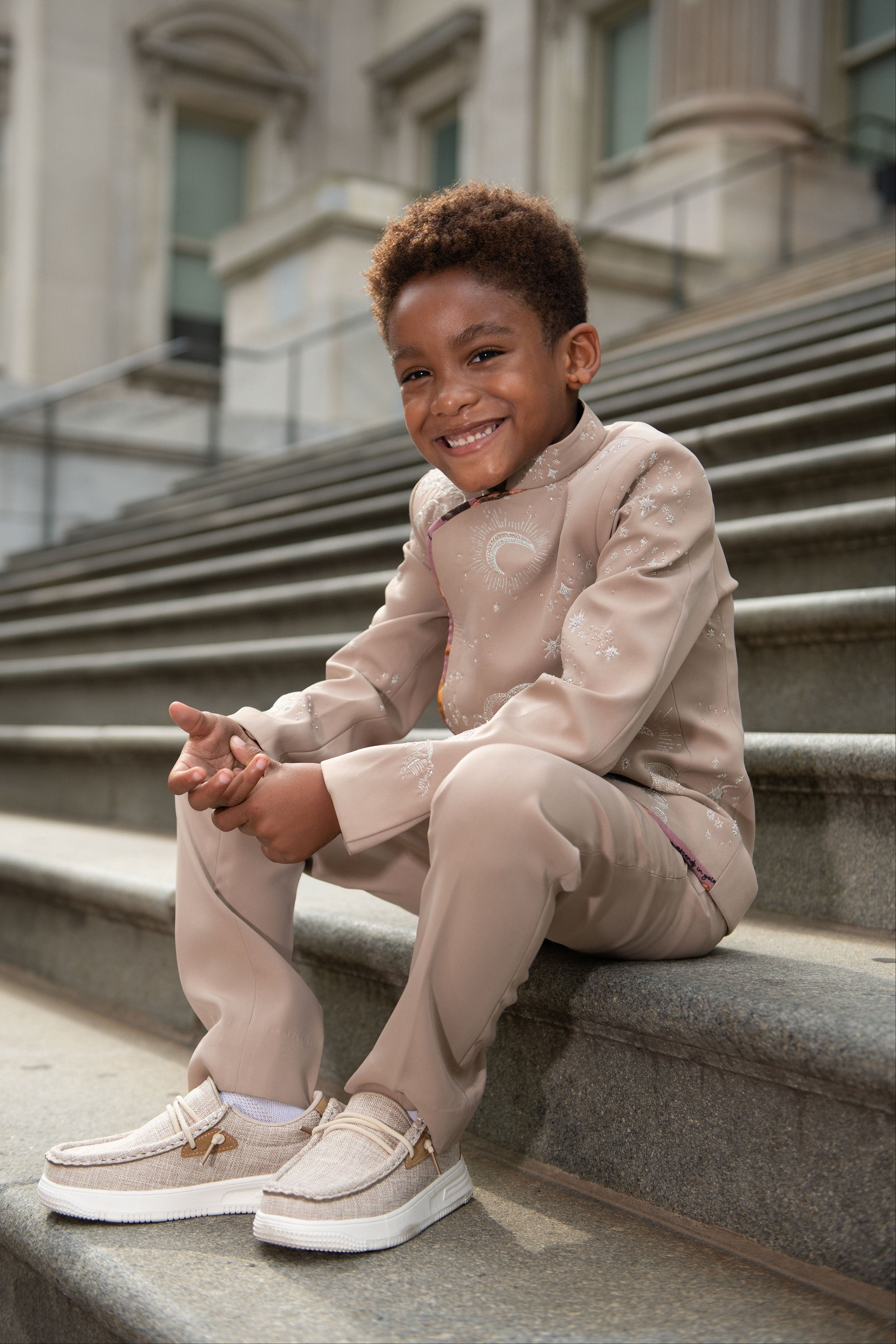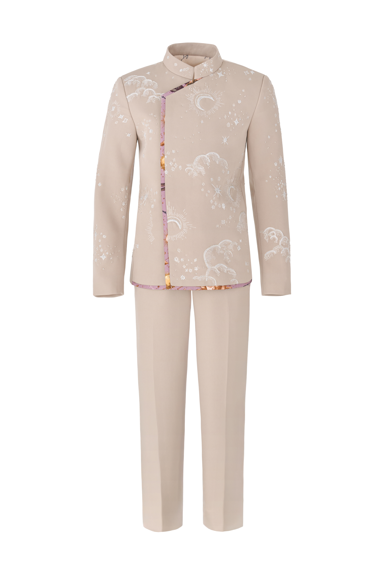 The Atlas tailored asymmetrical blazer presents a clean, modern silhouette with distinctive style. It is enhanced by detailed hand embroidery that brings texture and an artistic touch to its smooth design. When paired with the matching straight-fit pants, the outfit achieves a polished and elegant look. The contrasting silk accent elevates the overall ensemble with quiet sophistication.