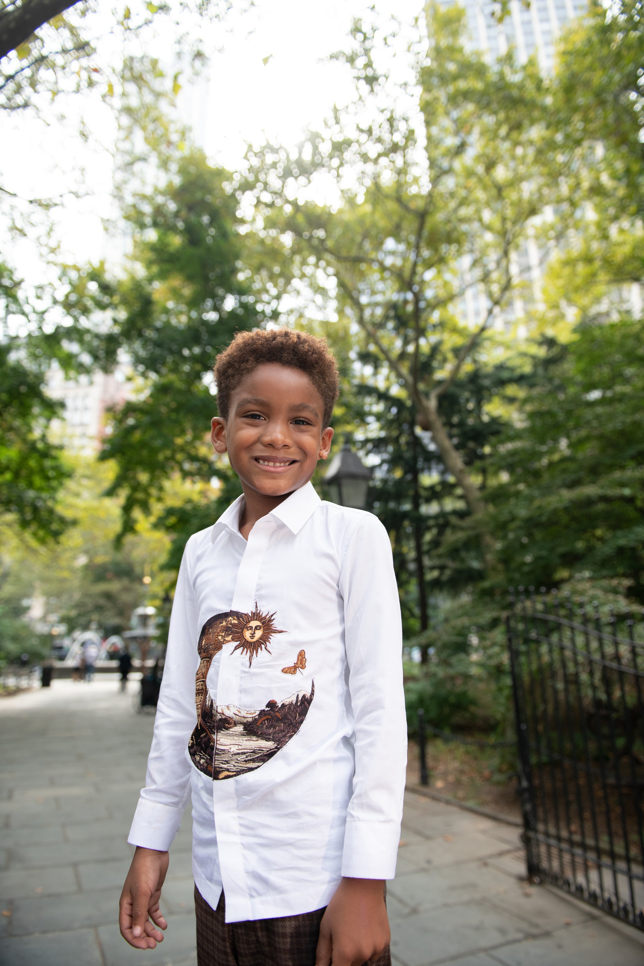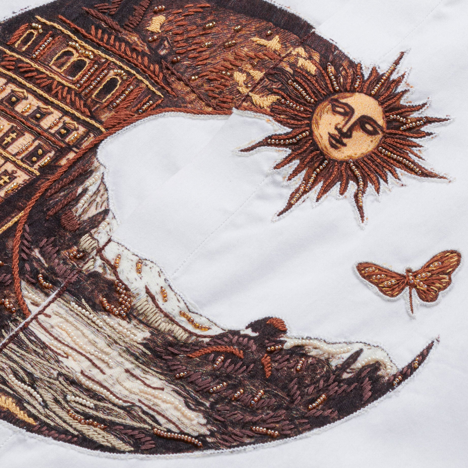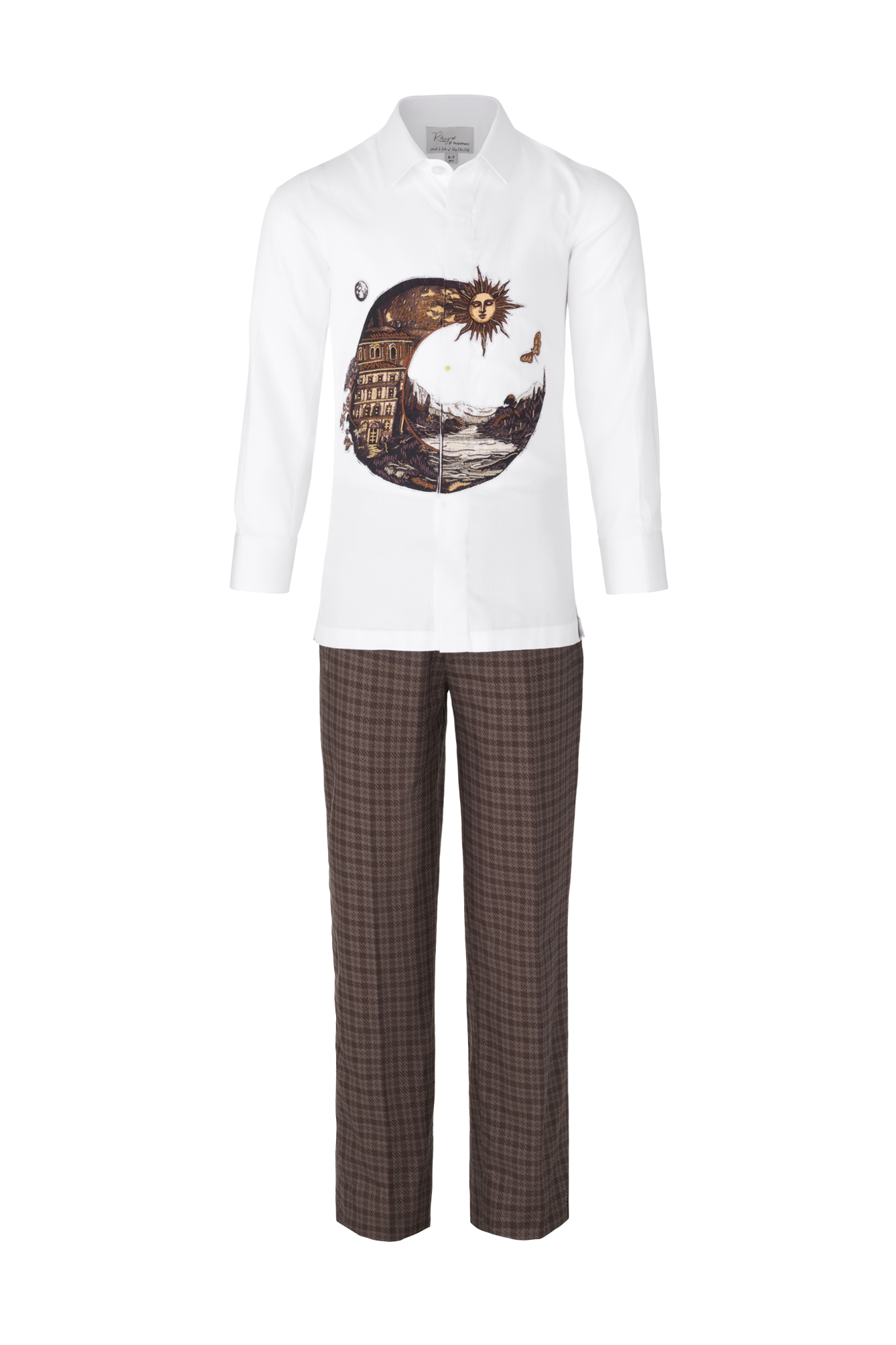 This whimsical full-sleeve shirt is custom printed with a vintage sun and a large half-moon containing a mansion, forming a dreamy, surreal pattern. When styled with tailored brown pants, it balances the shirt’s bold, imaginative design with a classic, polished silhouette. The mix of celestial motifs and refined tailoring creates a distinctive and stylish look infused with subtle mystery and charm.