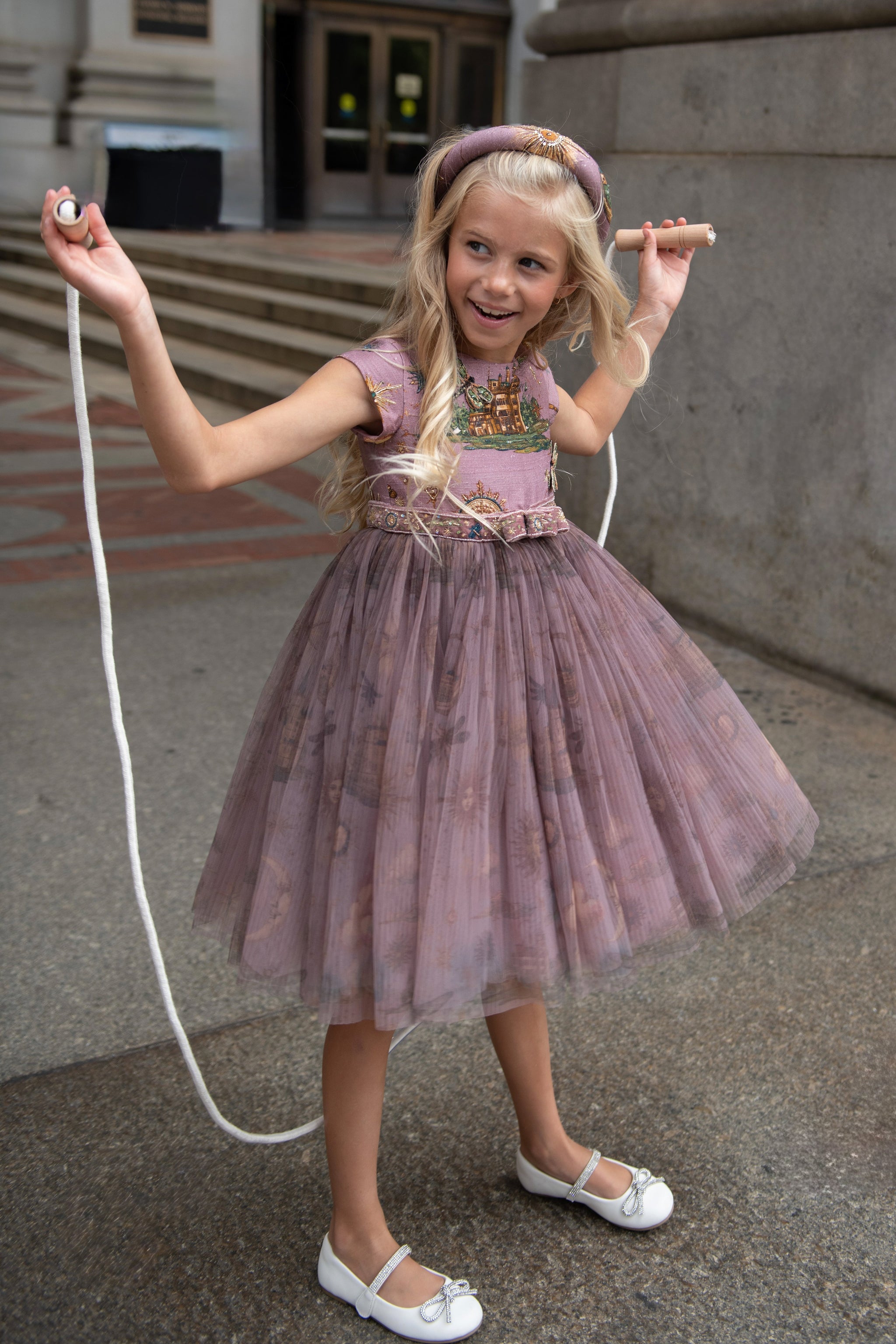 This elegant dress is crafted from custom-printed pure silk fabric featuring a vintage mansion motif. Hand-embroidered dragonflies adorn the fabric, lending a whimsical and delicate detail to the overall design. Layered atop the silk is soft tulle that adds volume and creates a dreamy silhouette. The fusion of rich silk, meticulous embroidery, and flowing tulle layers offers a unique blend of luxury and charm, making this dress a perfect choice for special occasions that call for enchanting sophistication.