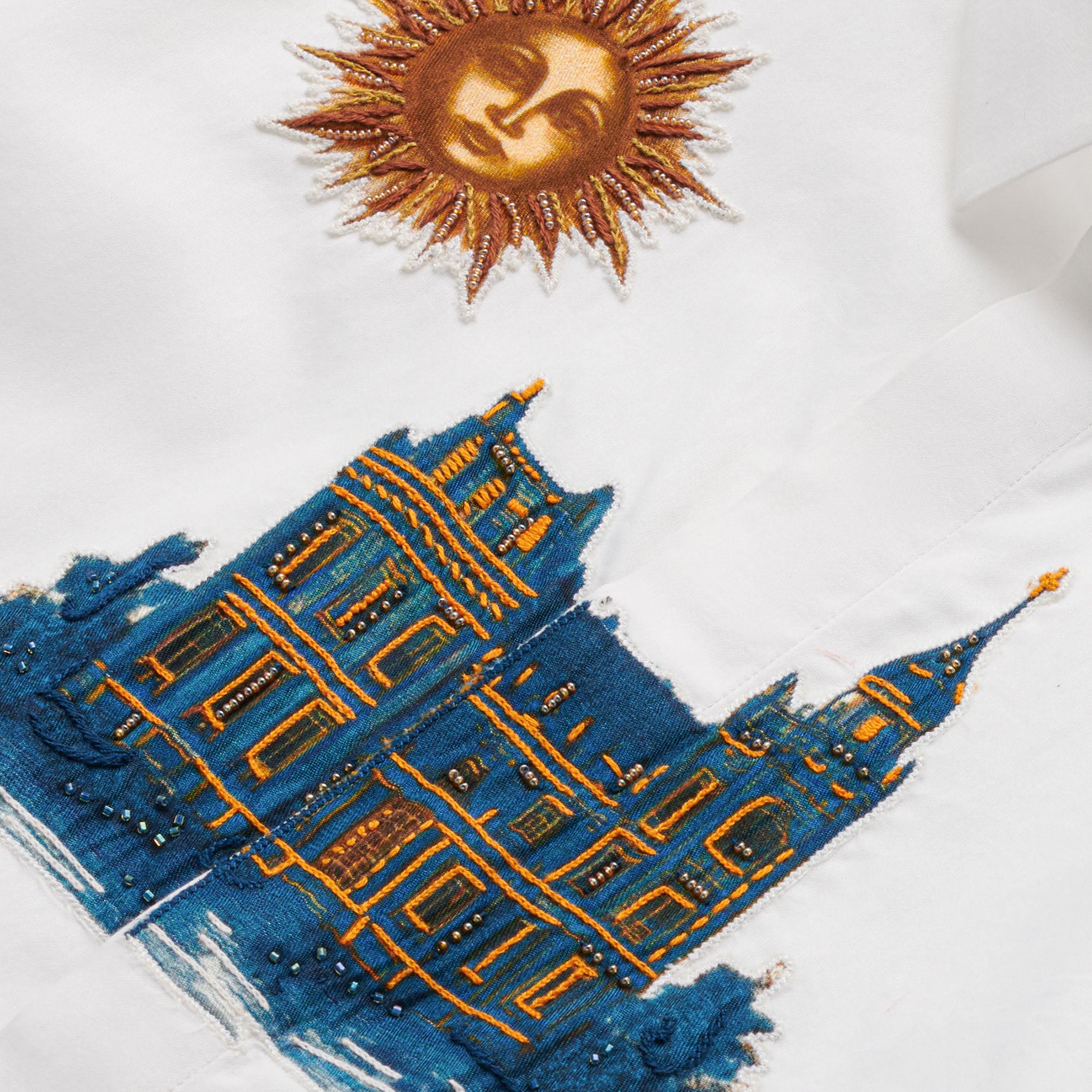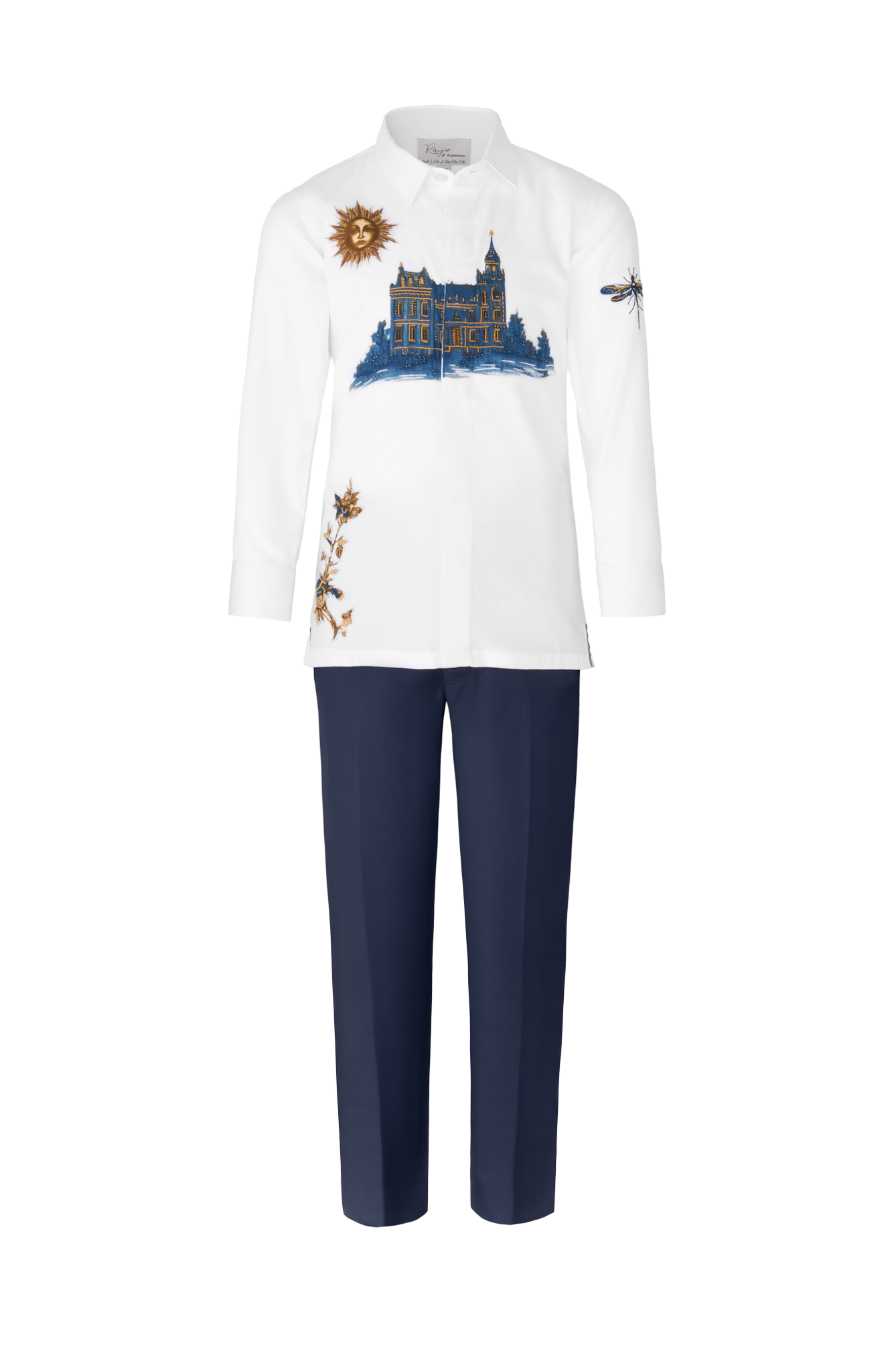 The Lennon boys set features a classic white shirt beautifully hand-embroidered with an intricate mansion motif, highlighted by detailed sun and flower designs. This exquisite craftsmanship adds a touch of artistry and charm to the attire. The shirt pairs seamlessly with formal blue pants, offering a sharp and polished look that is ideal for special occasions. Combining traditional elegance with comfortable wear, this set ensures your child stands out with style and sophistication.