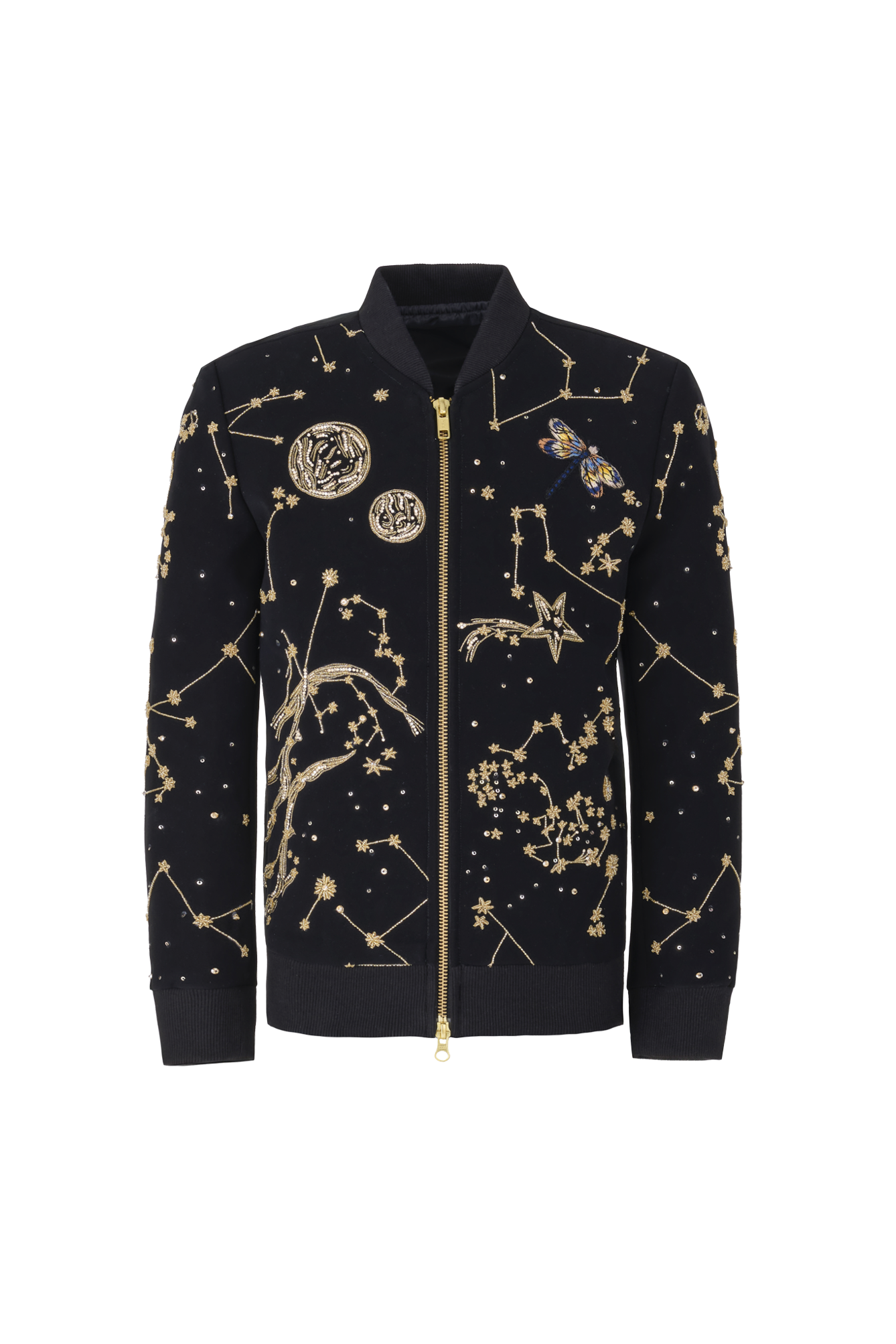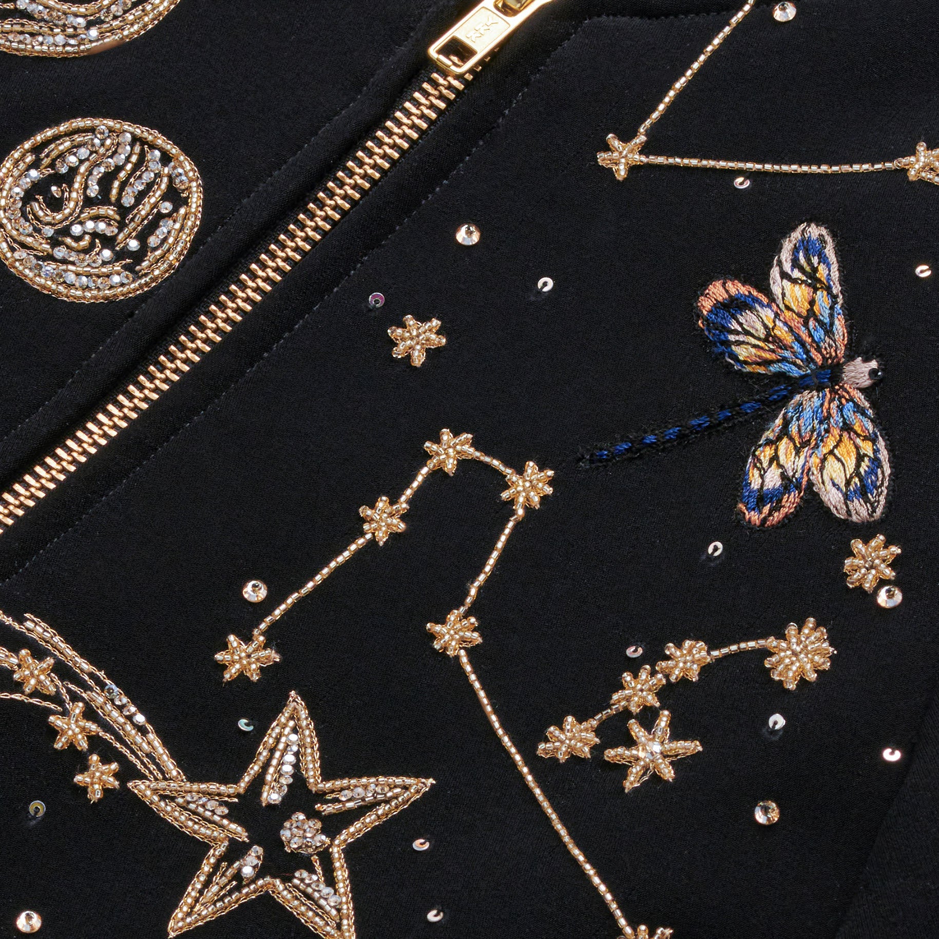 This velvet bomber jacket features hand-embroidered stars and planets for a cosmic look. The soft velvet feels rich, while a bright blue dragonfly adds a pop of color. It combines elegant style with a playful touch.
