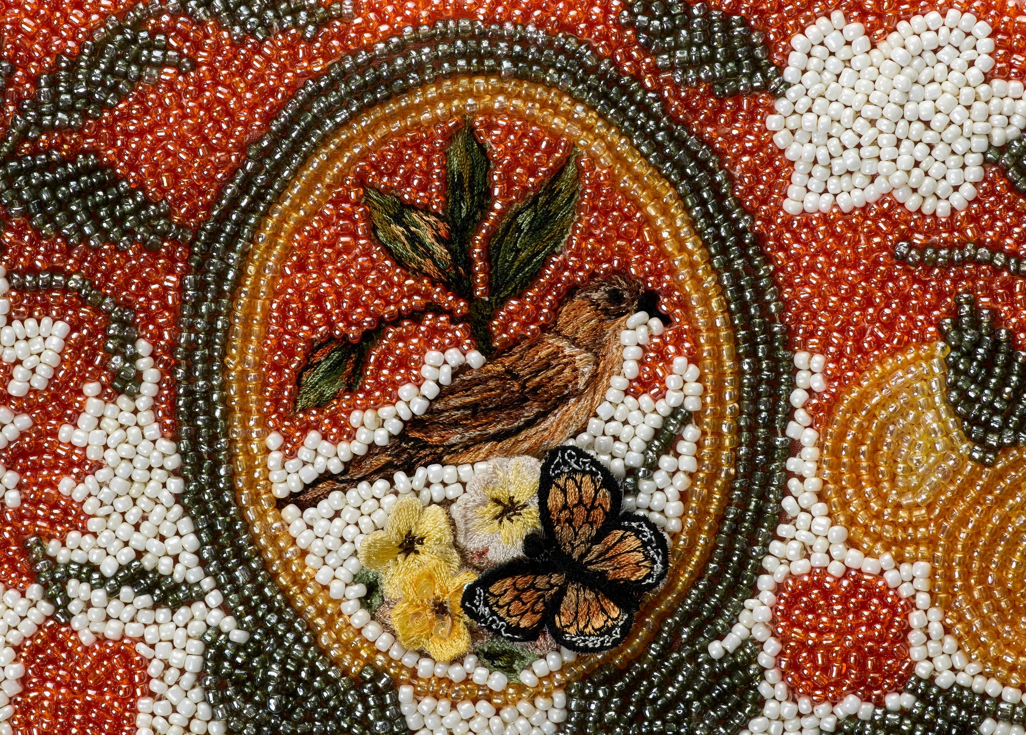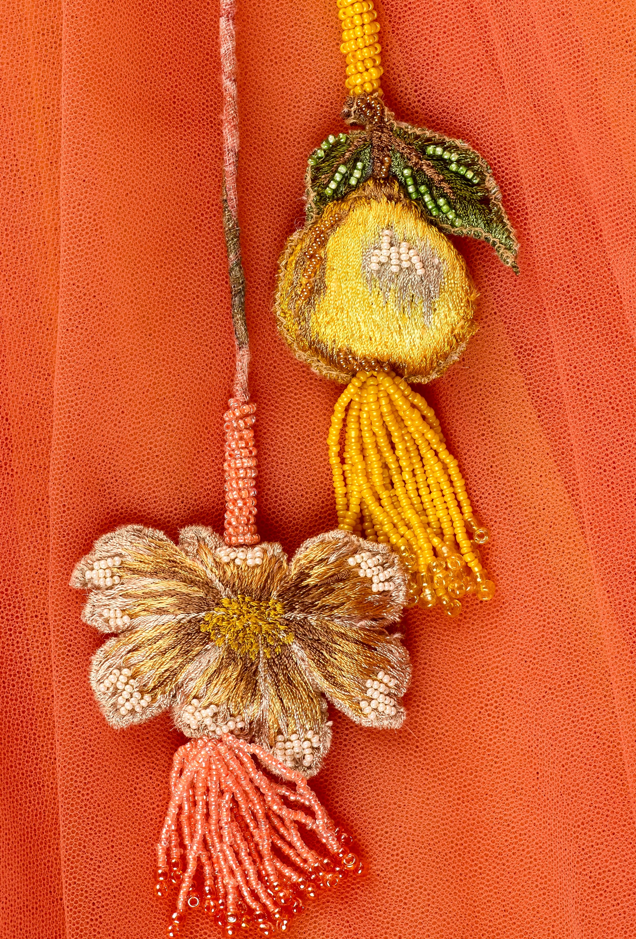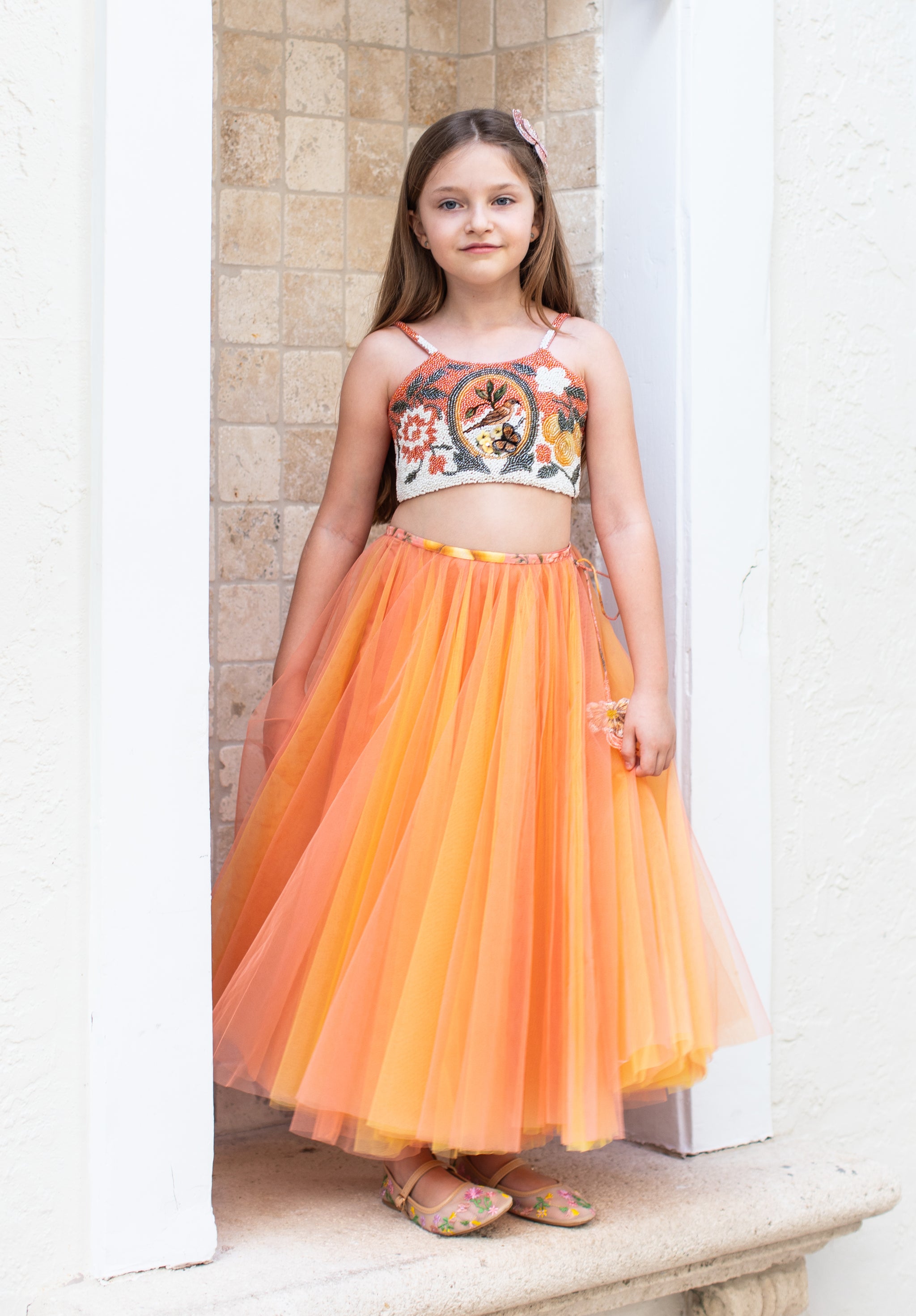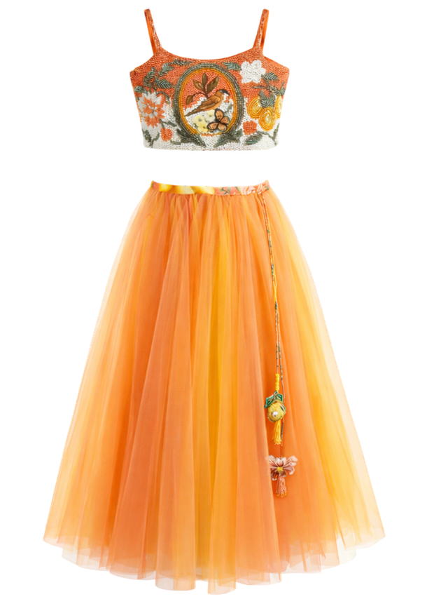A vibrant two-piece set featuring a hand-embroidered crop top adorned with intricate florals, butterflies, and nature-inspired motifs. Paired with a flowing layered tulle skirt in radiant sunset tones, this elegant ensemble captures the playful charm of a blooming summer garden.