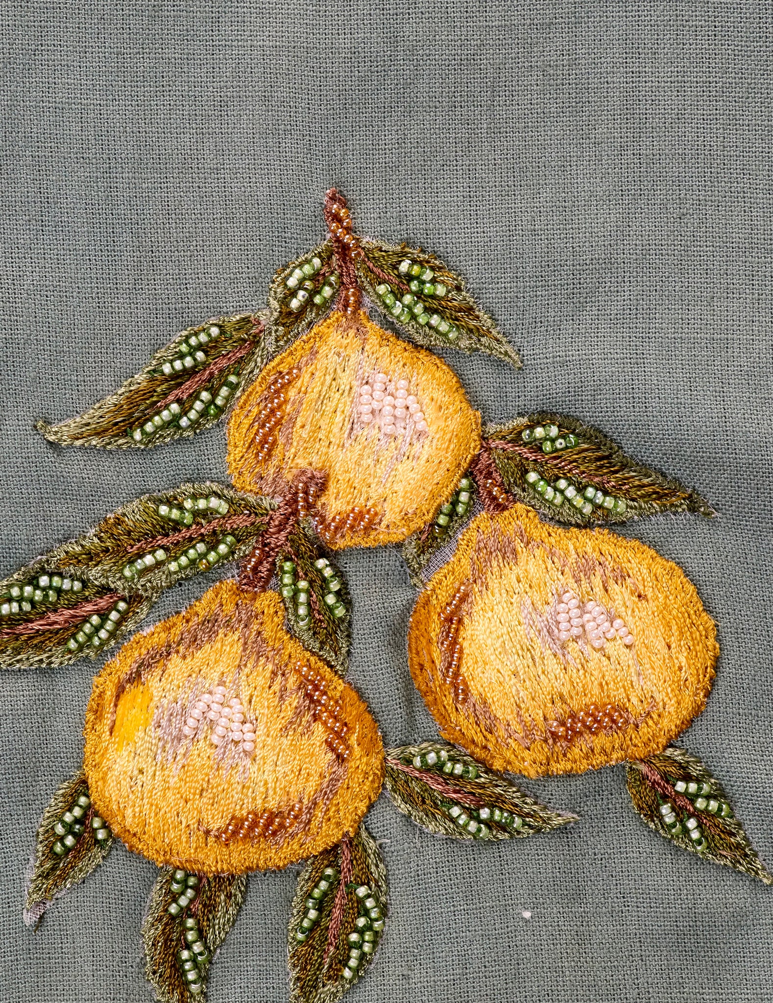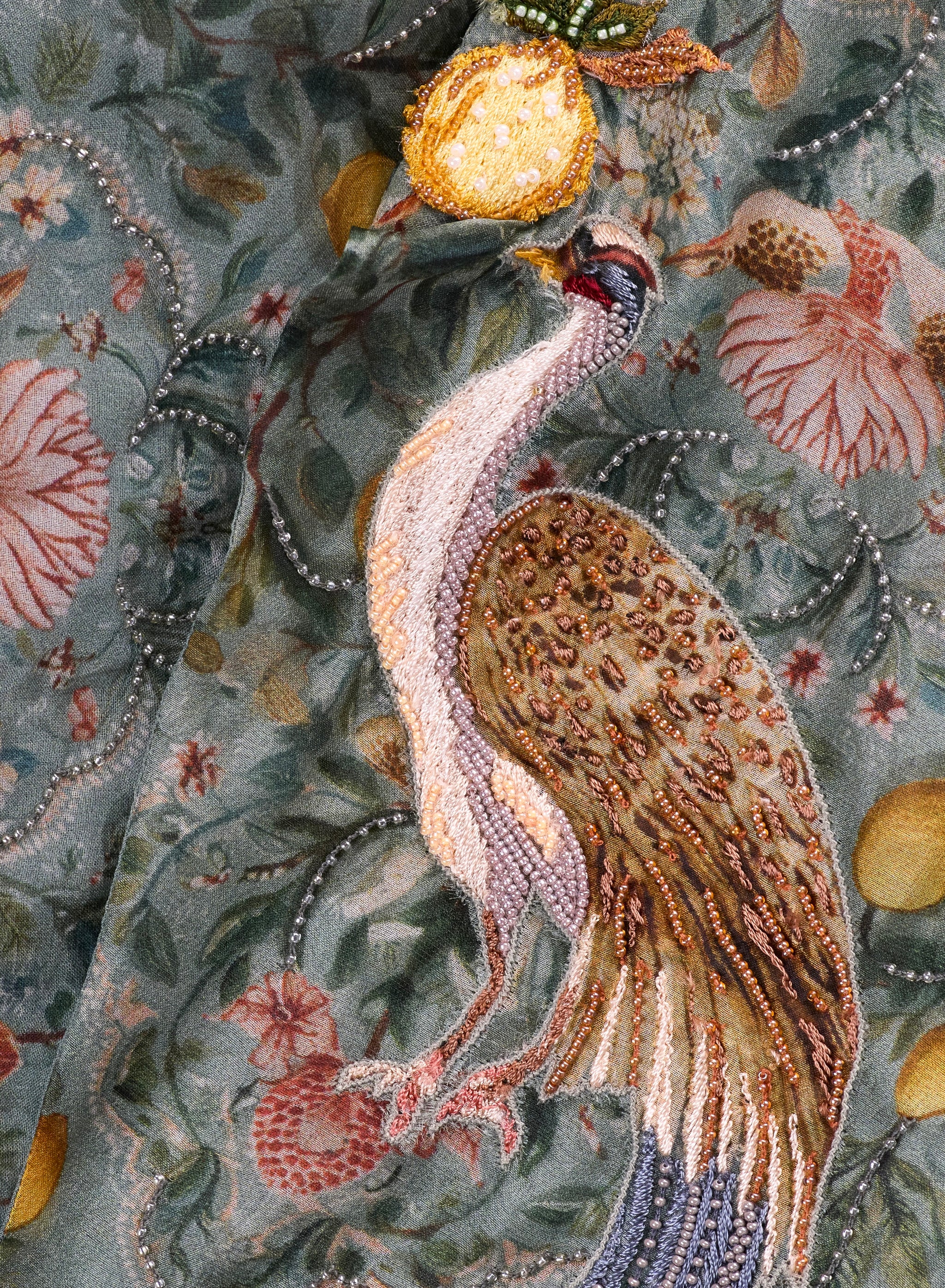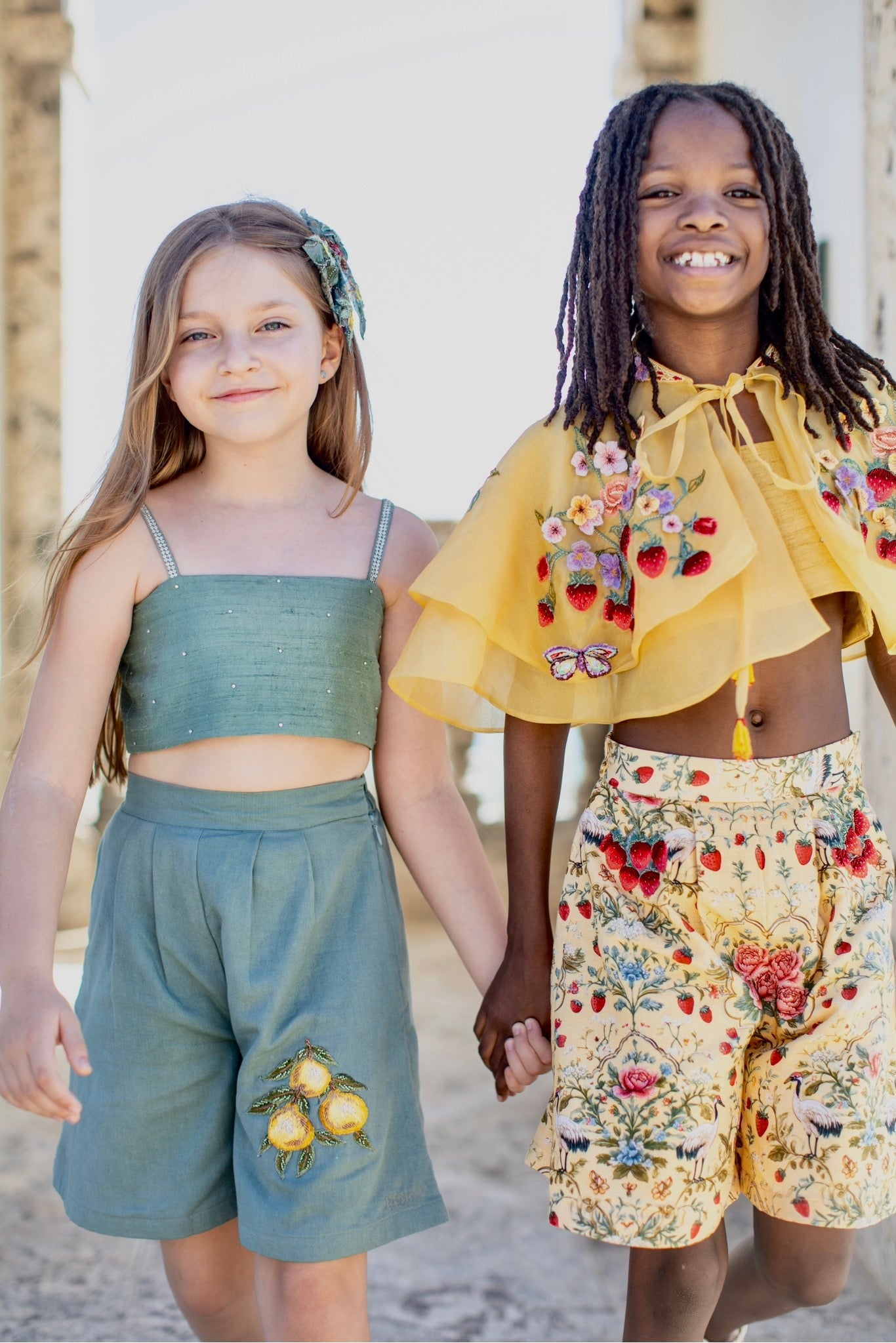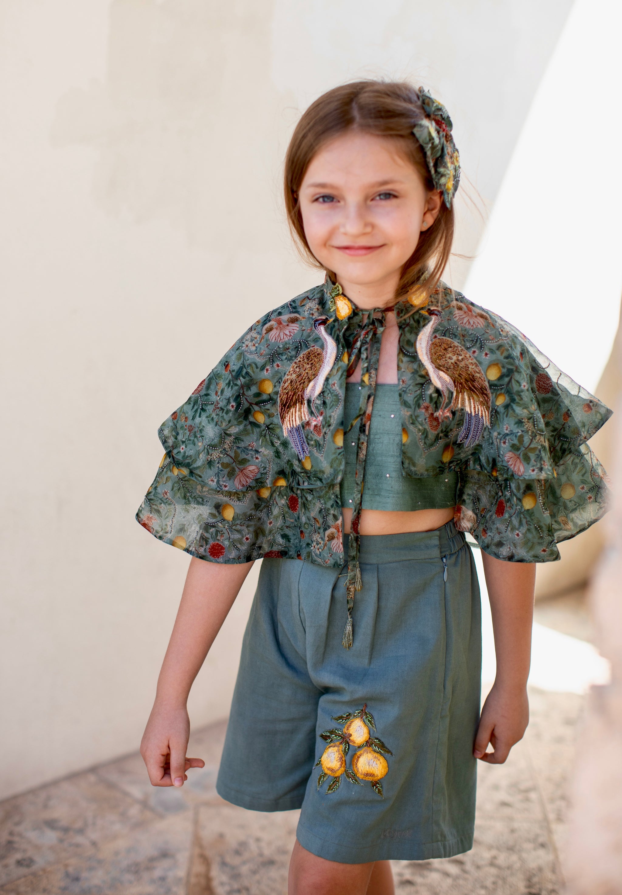 A playful yet refined three-piece ensemble featuring a crystal-embellished cropped top, tailored linen shorts, and a printed cape adorned with delicate beaded embroidery. The airy cape showcases a whimsical botanical print with graceful birds and citrus motifs, while the high-waisted shorts are finished with hand-embroidered lemons for a charming artisanal touch. A fresh and elegant look perfect for summer celebrations and special occasions.