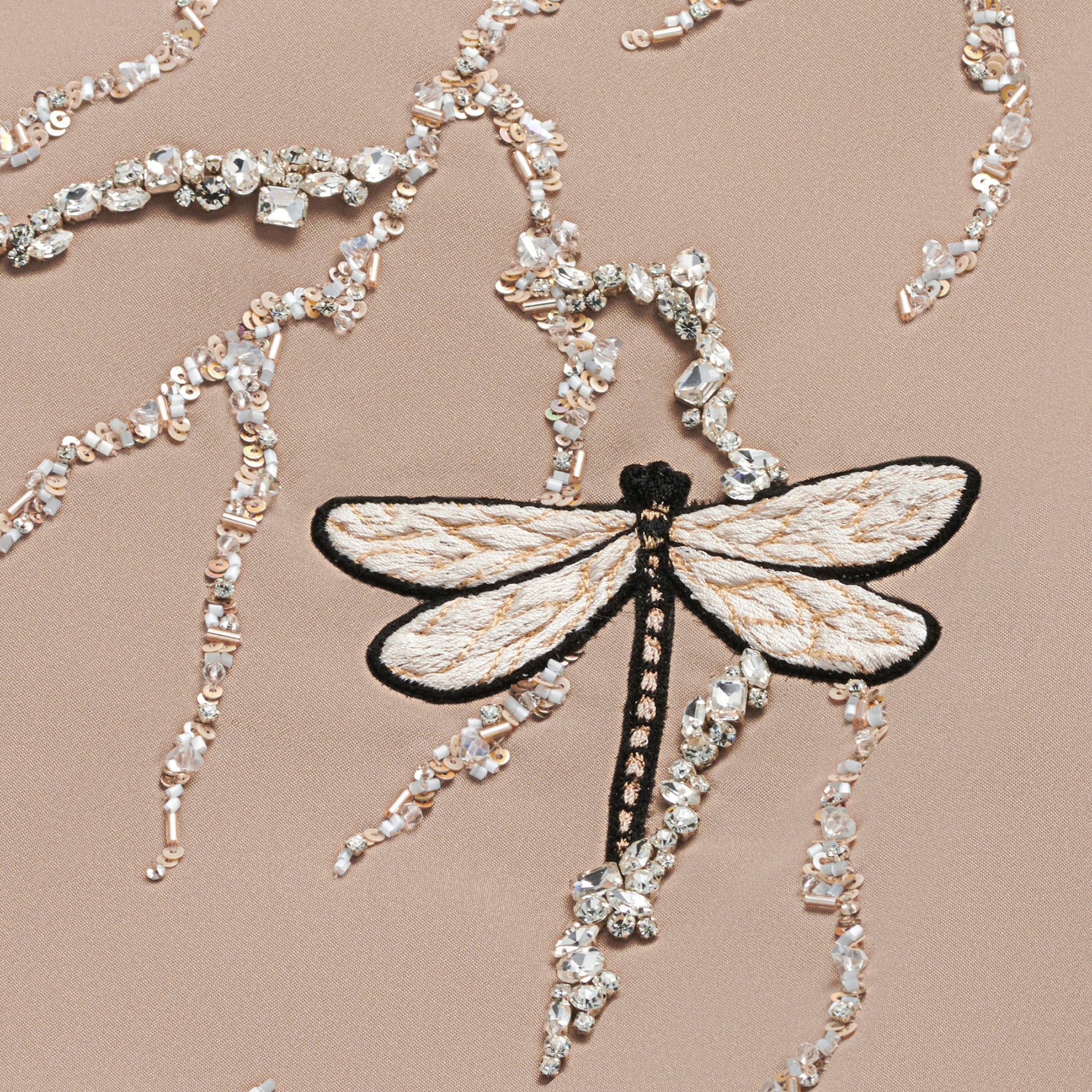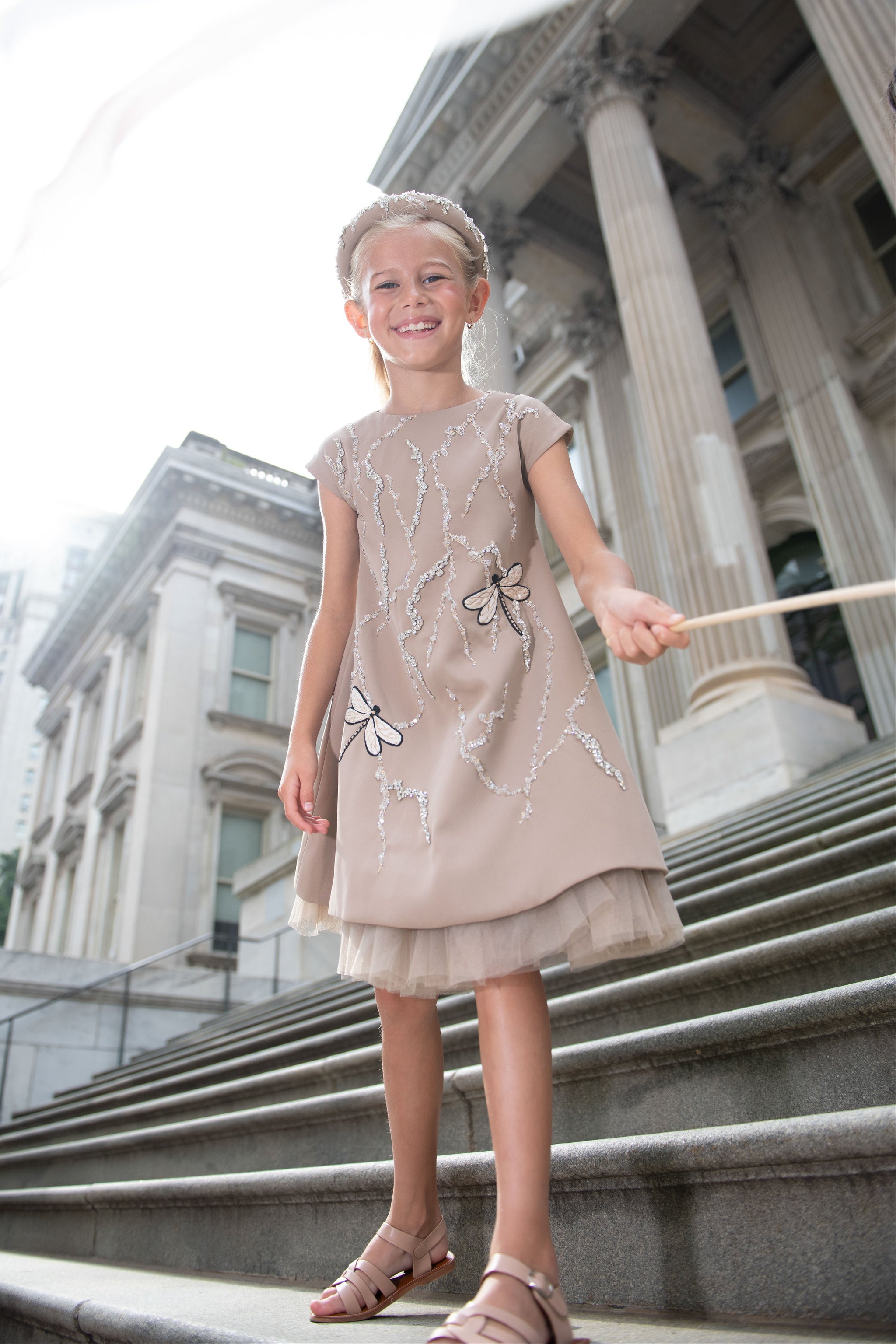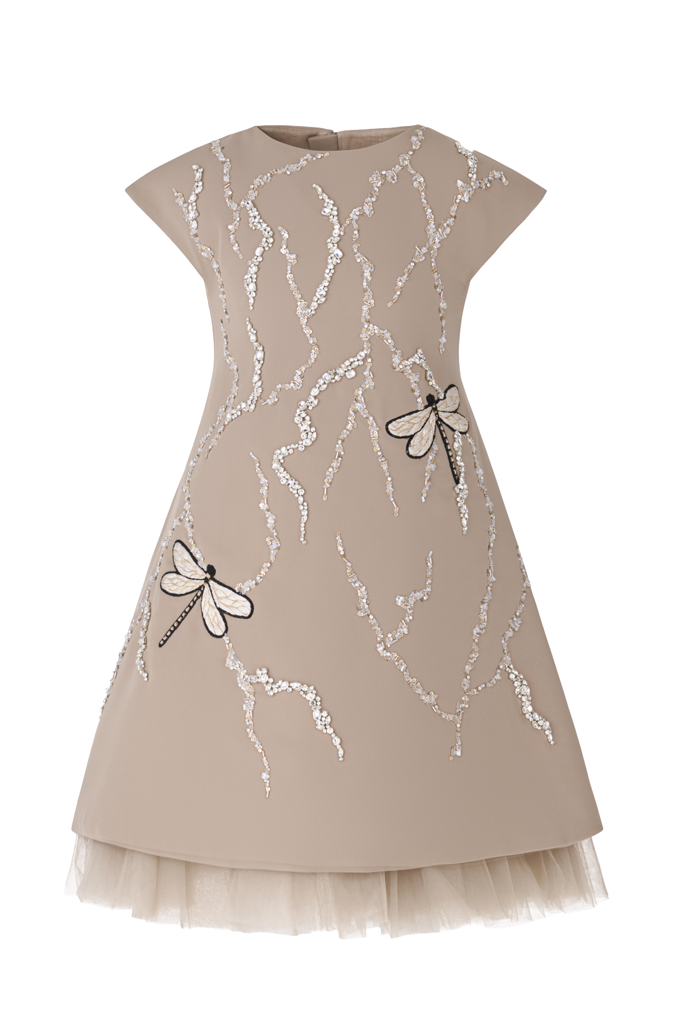 The Cleo dress features soft matte crepe fabric for a smooth, comfortable fit. Hand embroidery with crystals and beads adds sparkle and texture. Layers of delicate tulle give the dress volume and a graceful A-line shape, making it perfect for special occasions.